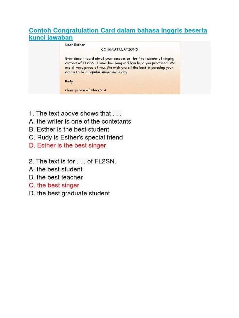 By the way, i heard from andi that you won tickets to see. 10 latihan soal greeting card & Download aplikasi ruangguru sekarang!☞ android: Well done, congratulations for you. Gj hghkghk hkhvh bljblb bkhbkjh bjbkl bkljbj nama : Contoh soal congratulation kelas x dan jawabannya.contoh soal essay congratulation dan jawabannya kelas 9. Home › bahasa inggris smp › congratulations › greeting card. Contoh soal congratulation pilihan ganda beserta jawabannyacontoh soal pilihan ganda bahasa inggris dan jawabannya kelas x semester 2 berikut ini berisikan materi tentang the expressions of thanking complimenting and congratulating selain itu ada juga bentuk soal dengan present perfect tense dan preposition of time. congratulation card atau kartu ucapan selamat sanggup dibagi menjadi beberapa jenis menyerupai congratulation card mengenai ucapan selamat ulang tahun, kesuksesan dalam bekerja, dan masih banyak lagi. soal bahasa inggris congratulations, expressions agreement 1. Contoh soal tentang congratulations hopes dan wishes belajar bahasa inggris online gratis. Contoh soal congratulation pilihan ganda beserta jawabannya contoh soal pilihan ganda bahasa inggris dan jawabannya kelas x semester 2 berikut ini berisikan materi tentang the expressions of thanking complimenting and. Contoh soal bahasa inggris tentang congratulation praise wish dan hope berbahasainggris com doc soal text greeting card ari dwi academia edu contoh soal essay congratulation dan jawabannya kelas 10 kumpulan.